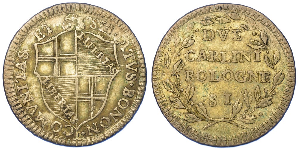 Stemma inquartato della città sormontato da maschera leonina. R/ DVE / CARLINI / BOLOGNE / SI. Iscrizione entro corona di foglie d'alloro. Cass. Chi 1. Gig. 12. Rarissimo. g. 5,47. Diam. mm. 28,08. Arg. Segni di ribattitura. MB/BB