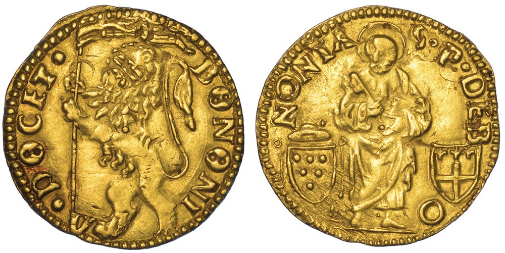Leone vessillifero rampante a s. R/ San Pietro nimbato, di fronte, tiene nella d. la chiave obliqua e nella s. il libro aderente al corpo; ai lati, in basso, due armette: a s. quella del Cardinale Giulio de' Medici e, a d., quella della Città. CNI 23 v. Munt. 104. Chimienti (Adriano VI) 269. g. 3,46. Diam. mm. 23,39. Oro. Segni di ribattitura. Buon BB