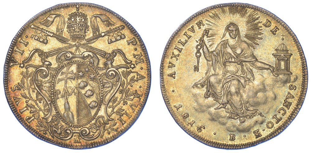Stemma sormontato da triregno e chiavi decussate. R/ La Santa Chiesa velata, col capo raggiante, seduta su nubi tiene le chiavi e un piccolo tempio a cupola. Gig. 36. Molto raro. g. 13,16. Diam. mm. 34,43. Arg. Brillante patina lievemente iridescente. q.SPL