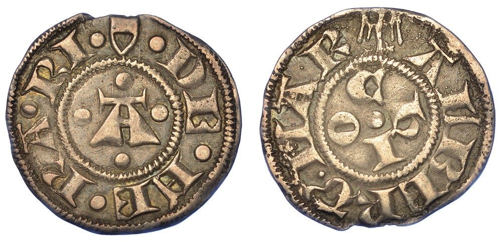 Grande A accantonata da 4 globetti. R/ Lettere C h I O a croce. MIR 220. CNI 1/2. Bellesia 1. Rarissimo. g. 1,16. Diam. mm. 17,55. Arg. MB/BB