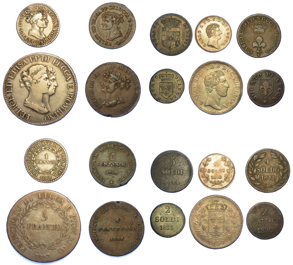 Monetazione mista del XIX secolo, fra cui si segnalano: ELISA BONAPARTE E FELICE BACIOCCHI, 1805-1814. 5 Franchi 1807 - CARLO LUDOVICO DI BORBONE, 1824-1847. 2 Lire 1837 - 10 Soldi 1833. Argento e rame. Conservazioni da MB a BB/q.SPL.