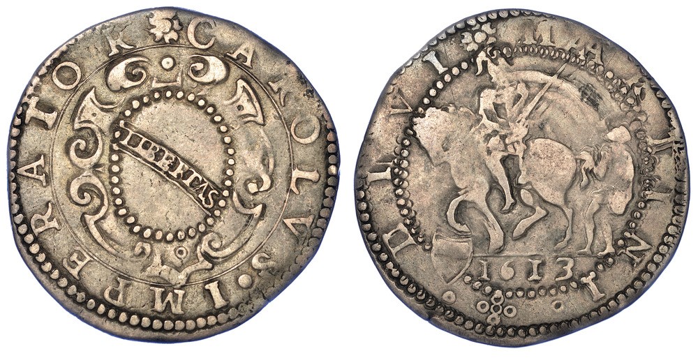 Stemma ornato. R/ San Martino, a cavallo, divide il mantello col povero. MIR 206/1. CNI 617. Rarissimo. g. 10,65. Diam. mm. 35,13. Arg. MB