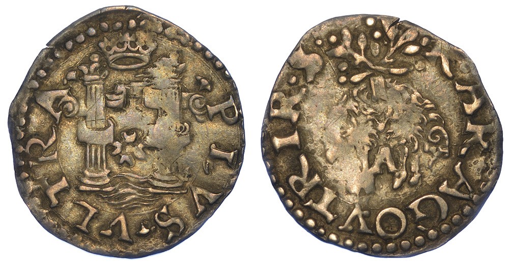 Colonne d'Ercole sormontate da corona; tra esse, fiore. R/ Toson d'oro sospeso; sotto, A. MIR 151/2. CNI 750. Pannuti- Riccio 39. g. 0,67. Diam. mm. 17,82. Arg. MB