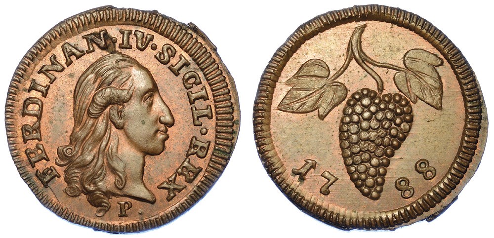 Busto di Ferdinando a d. R/ Grappolo d'uva; sotto, 1788. Gig. 164 (R/5). MIR 406/1 (R/5). Pannuti-Riccio 136. Della massima rarità. g. 2,15. Diam. 19,02. Rame. q.FDC