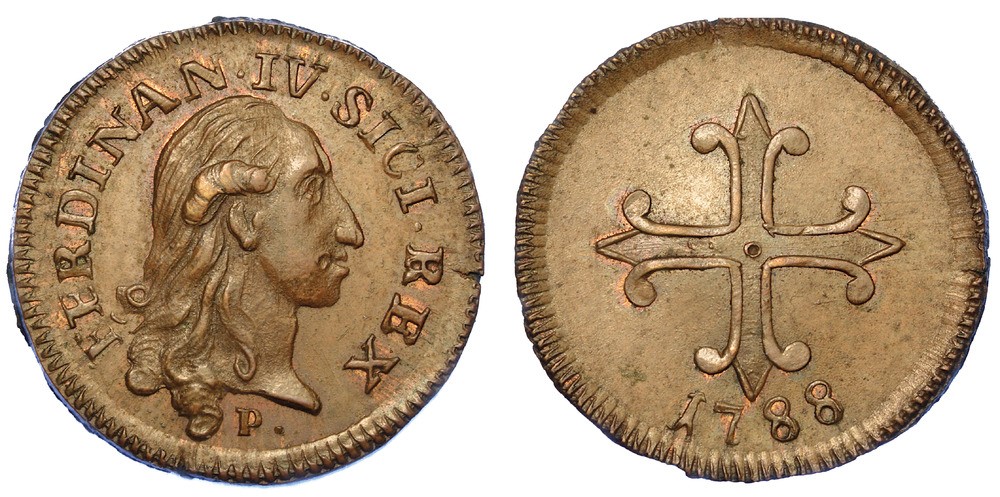 Busto di Ferdinando a d. R/ Croce gigliata; sotto, 1788. Gig. 174 (R/4). MIR 409/1 (R/5). Pannuti-Riccio, 144. Estremamente rara g. 2,08. Diam. 18,20. Rame SPL