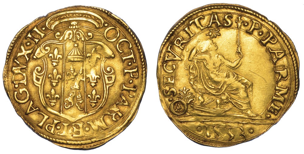 Stemma coronato. R/ La Sicurezza seduta verso d. con scettro gigliato; dietro, una pianta di giglio; in esergo, 1553. MIR 925. CNI 13 var. Estremamente rara (varietà senza l'ara accesa davanti alla Sicurezza al rovescio). g. 3,27. Diam. mm. 24,06. Oro. Lieve ondulazione. Buon BB