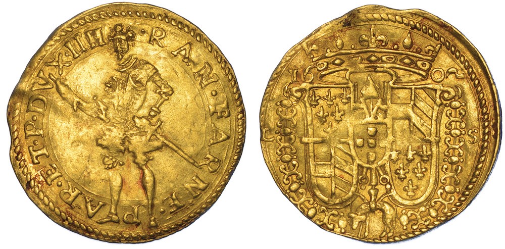 Il Duca corazzato, a figura intera, stante a sinistra. R/ Stemma coronato; ai lati, la data. MIR 981/1. Molto raro. g. 3,20. Diam. mm. 21,82. Oro. Tondello lievemente ondulato. BB