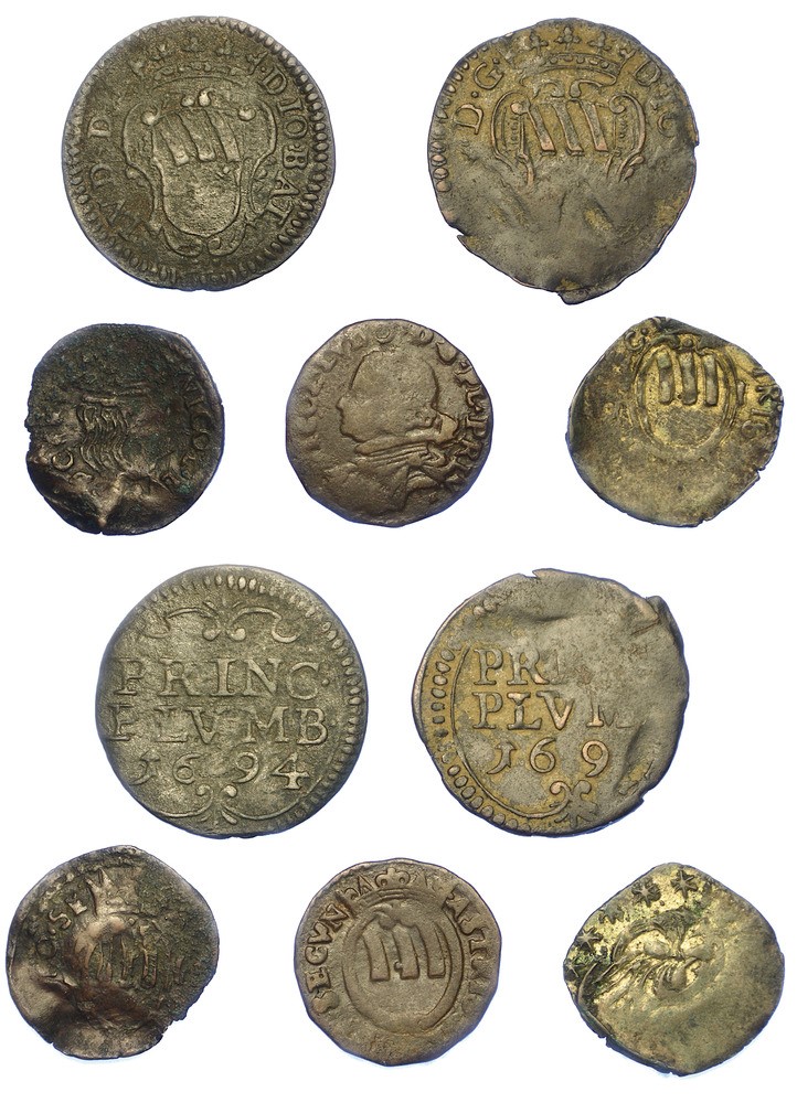 Monetazione mista del XVII secolo coniata durante i governi di Niccolò Ludovisi e Giovanni Battista Ludovisi. Mistura e rame. Conservazioni da B a MB.
