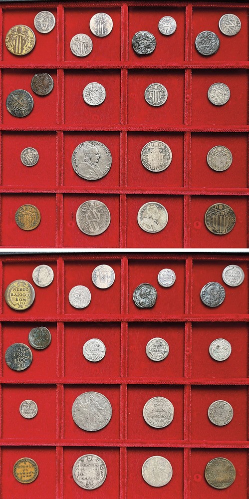Monetazione pontificia mista del XVIII secolo, fra cui si segnalano: CLEMENTE XII, 1730-1740. Testone A. V (foro otturato) - BENEDETTO XIV, 1740-1758. Mezzo Scudo 1753/A. XIV (tracce di montatura) - 2 Carlini A. IX. Argento e rame. Conservazioni da B a BB.