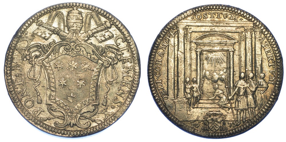Stemma poligonale in cornice, sormontato da tiara, chiavi decussate. R/ Portico di San Pietro con Porta Aperta raggiante e pellegrini; in esergo, 16 (stemma) 75. Munt. 22. CNI 24. Molto raro. g. 9,36. Diam. mm. 32,30. Arg. BB/q.SPL