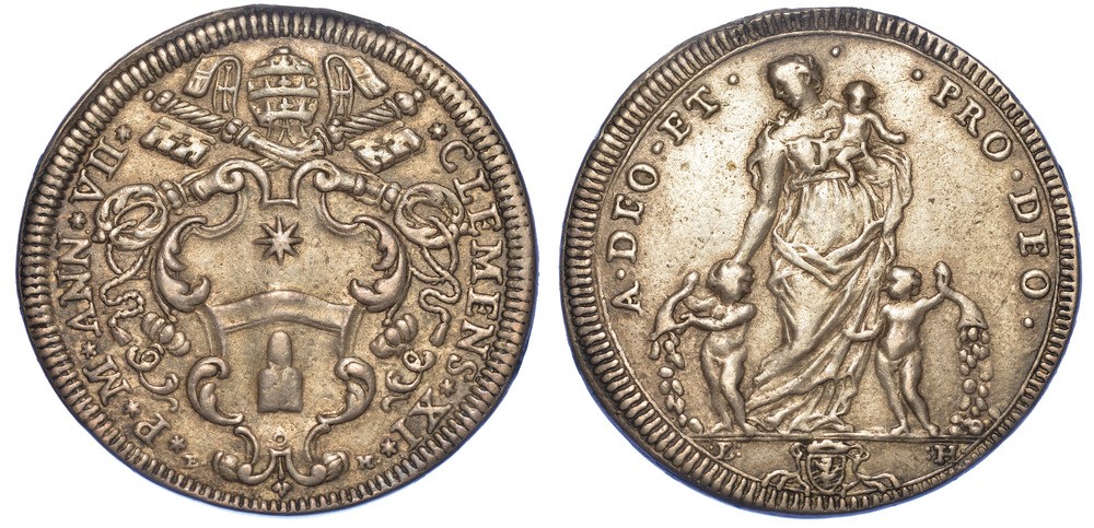 Stemma sormontato da triregno e chiavi decussate con cordoni e fiocchi. R/ La Carità stante con bambino in braccio; ai suoi piedi, due putti svuotano, ognuno, una cornucopia. MIR 2290/1. CNI 96. Munt. 59. Molto raro. g. 8,57. Diam. mm. 31,71. Arg. Traccia di appiccagnolo. BB
