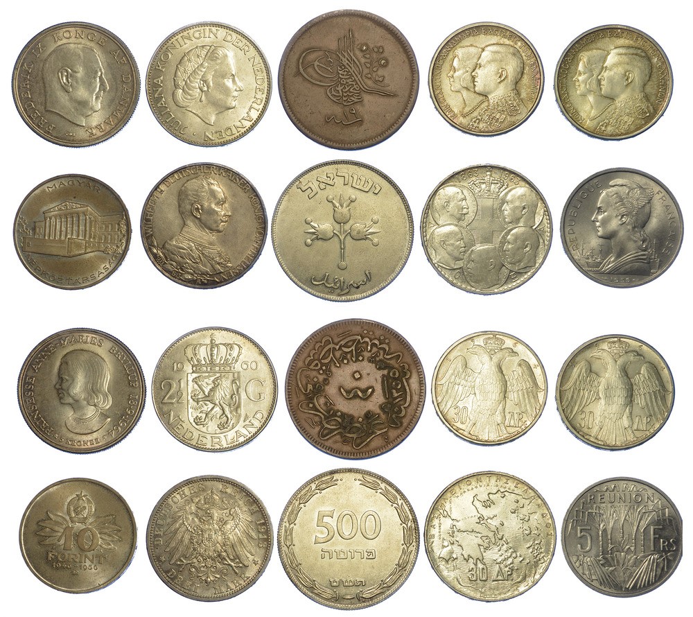DANIMARCA. 5 Kroner 1964 (Frederik IX). FRANCIA - REUNION. 5 Francs 1955. GERMANIA. 3 Mark 1913 (Wilhelm II). GRECIA. 30 Drachmai 1963 (Paul I) - 1964 (2 esemplari, Constantine II). ISRAELE. 500 Pruta 1949. OLANDA. 2 1/2 Gulden 1960 (Wilhelmina I). TURCHIA. 40 Para. UNGHERIA. 10 Forint 1956. Esemplari in argento e alluminio. Conservazioni da BB a q.FDC.