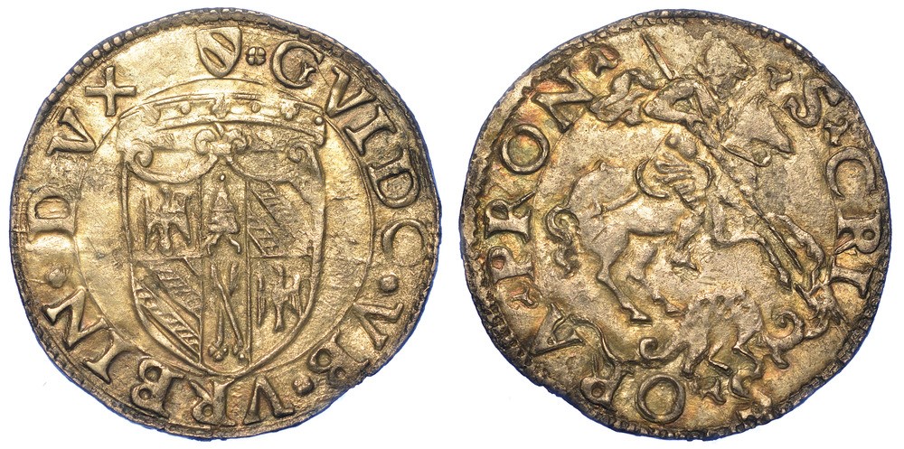 Scudo semiovale coronato. R/ San Crescentino, elmato e in armatura, al galoppo a d., nell'atto di trafiggere il drago. CNI 14. Molto raro. g. 1,86. Diam. mm. 23,78. Arg. BB/SPL