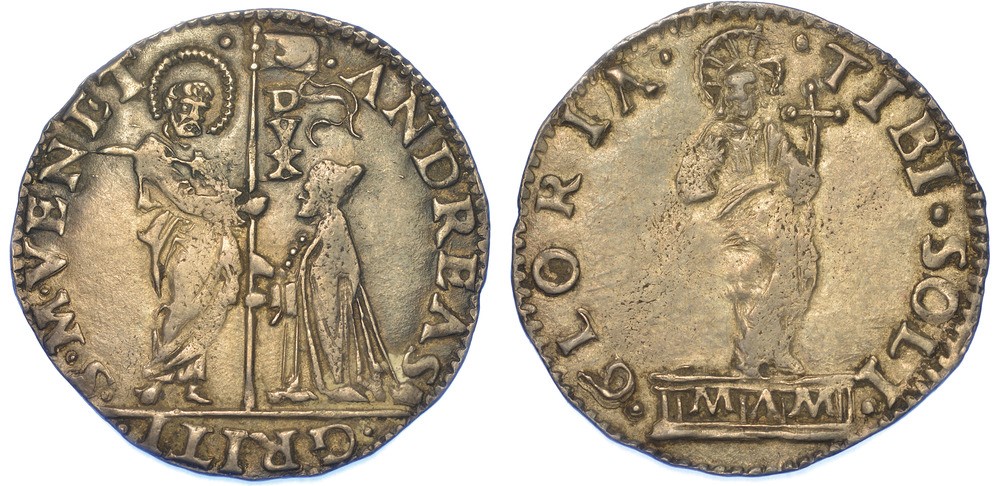 S. Marco, in piedi, porge il vessillo al doge genuflesso. R/ Il Redentore in piedi su piedistallo entro il quale vi sono le iniziali del massaro M A M. Paolucci 5. CNI 155v. g. 6,58. Diam. mm. 32,70. Arg. q.BB
