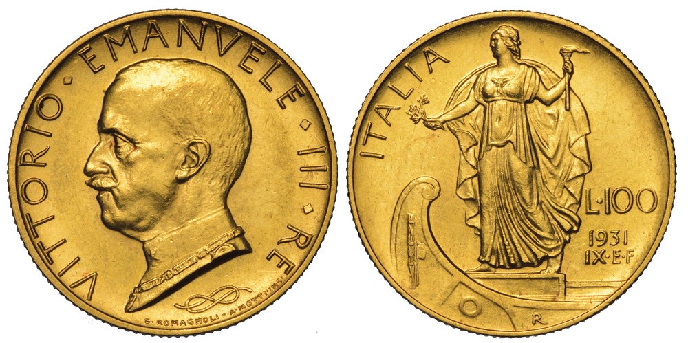 Testa del sovrano a s. R/ Prora di nave fregiata dal fascio littorio, sulla quale figura intera di donna rivolta a s. con fiaccola e ramo di alloro. Gig. 9. g. 8,79. Diam. mm. 23,64. Oro. SPL/q.FDC