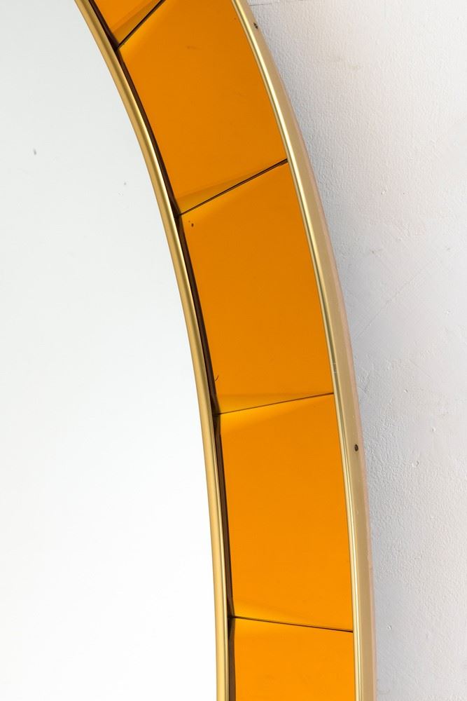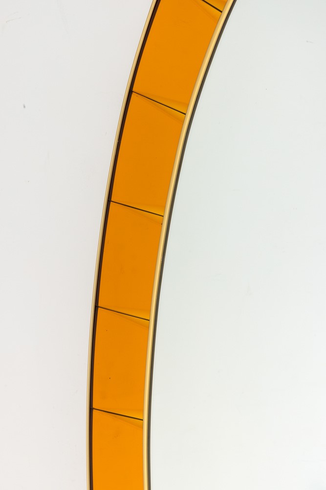 Struttura in legno con piedini e profili in ottone. Fascia perimetrale in cristallo colorato specchiato e molato.