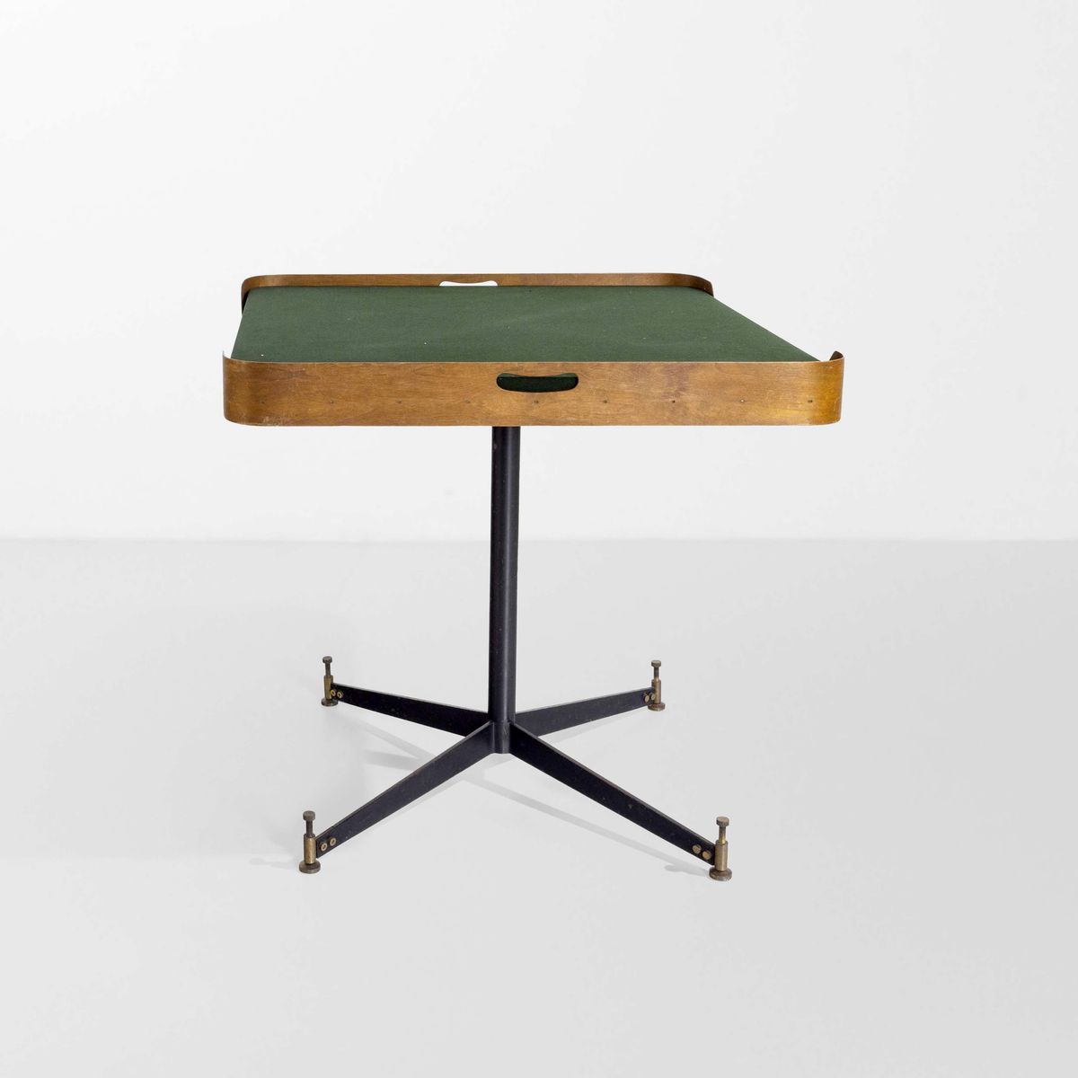 Piano in legno a vassoio con piano rimovibile in legno rivestito in velluto. Struttura in metallo laccato e ottone.