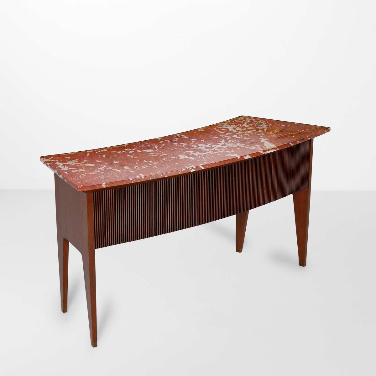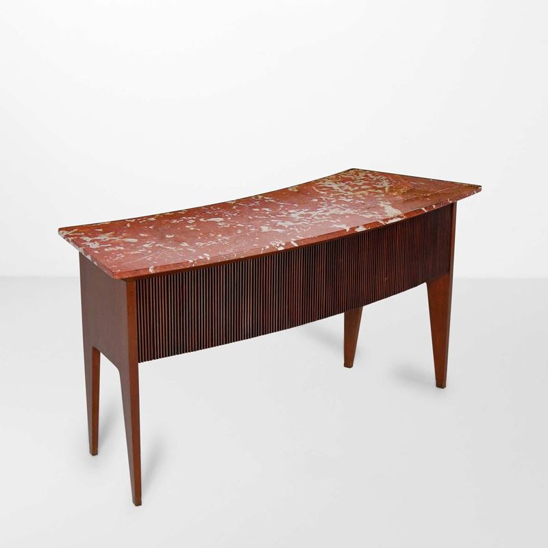 Struttura in legno con rivestimenti in legno grissinato. Piano in marmo rosso Francia. Dettagli in ottone.
