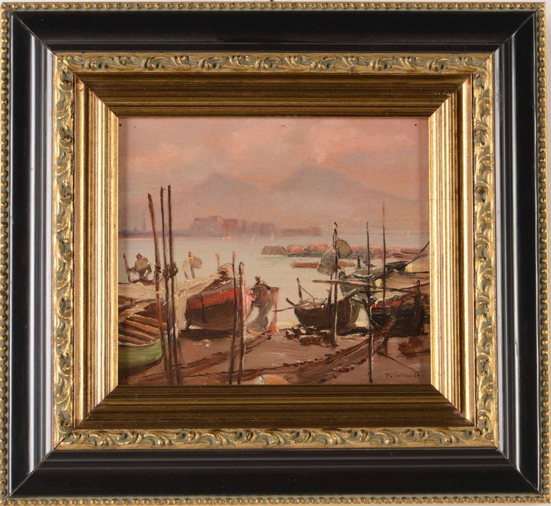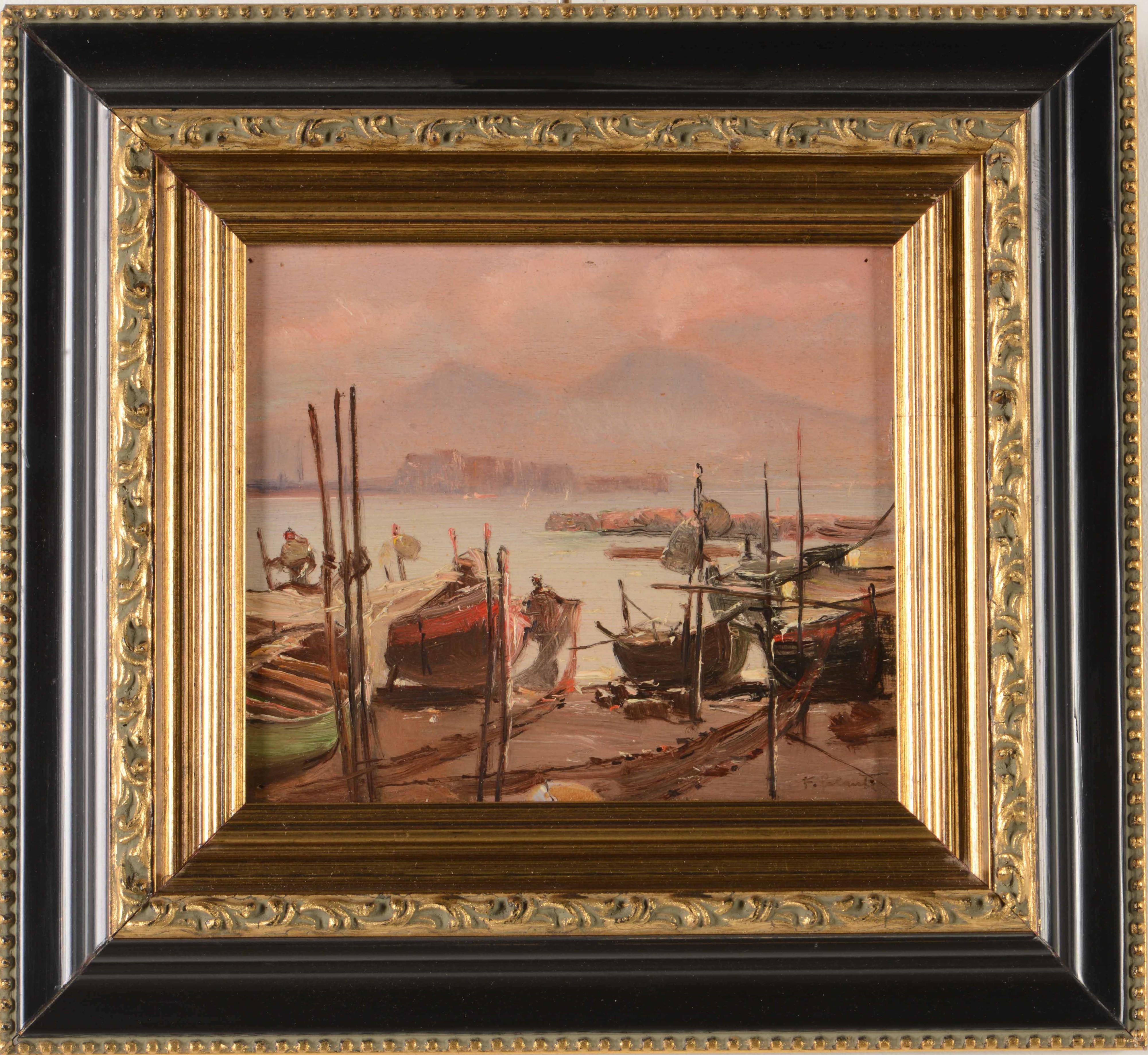 Marina con barche e Vesuvio