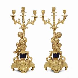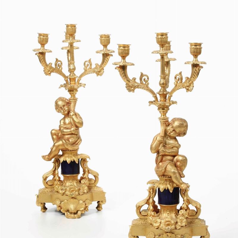 Coppia di candelabri a quattro luci in bronzo dorato. XIX secolo