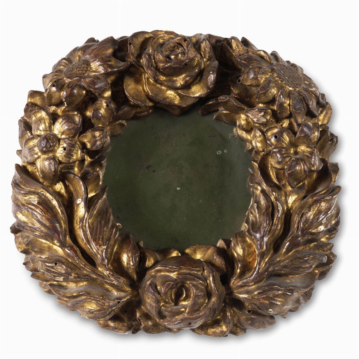 Specchiera a cesto in legno intagliato e dorato