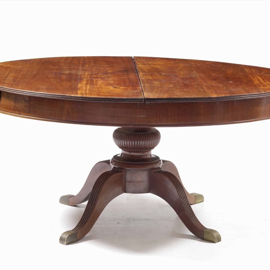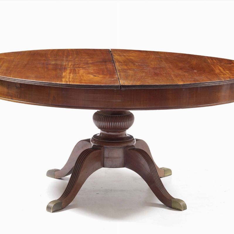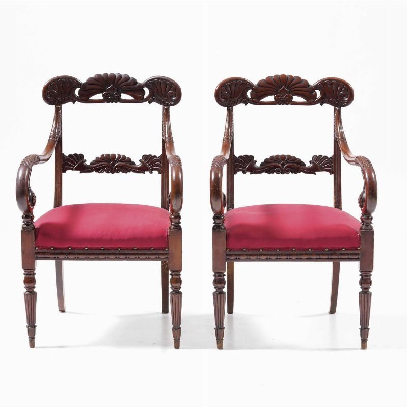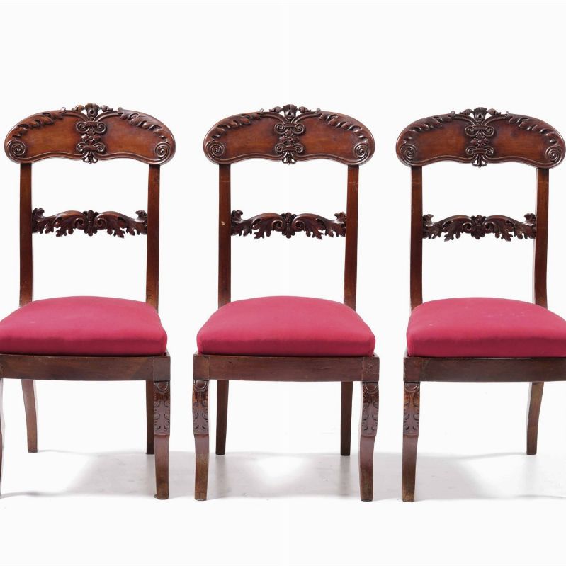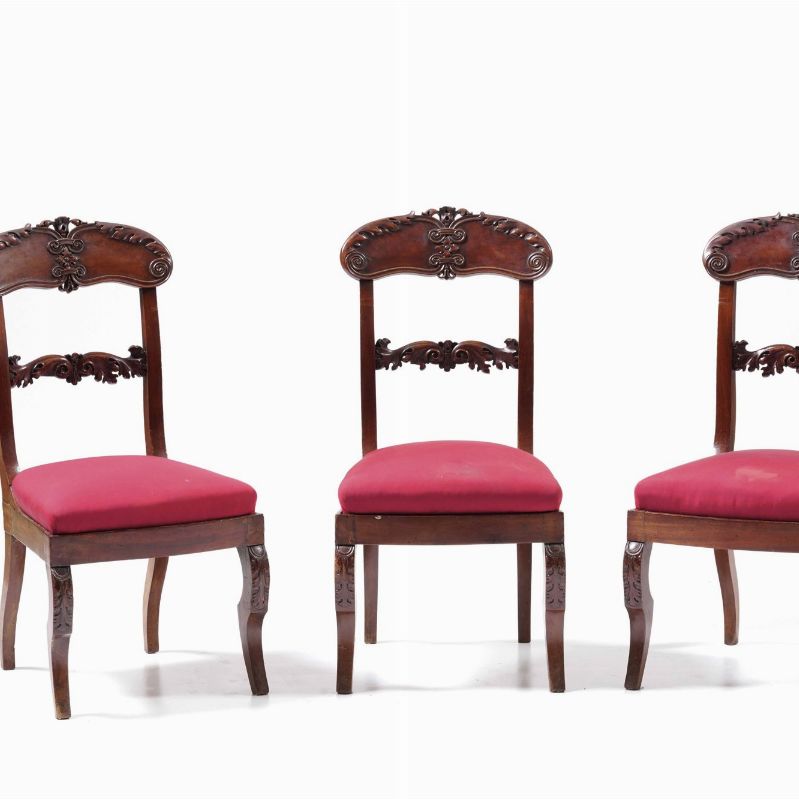 Tavolo in legno con sei sedie e due poltrone in legno intagliato. XIX secolo