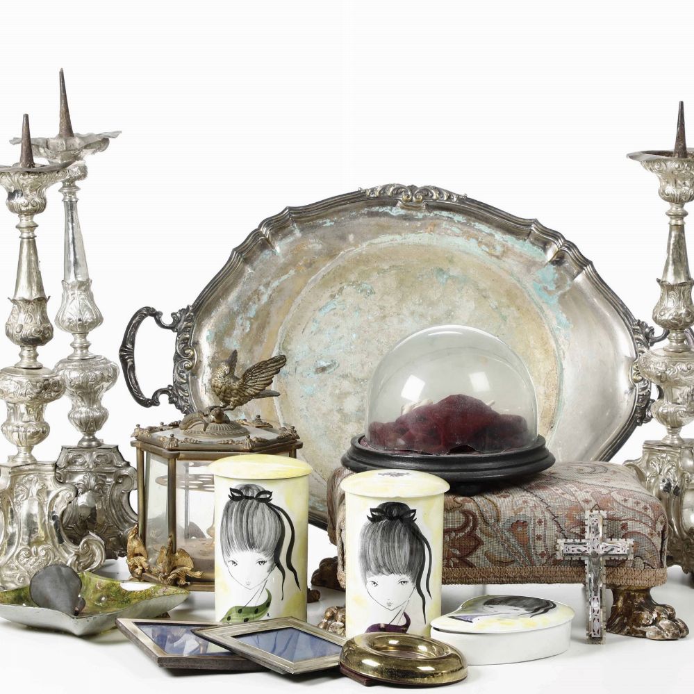 Vassoio in metallo, tre candelieri argentati, ceramiche e altro
