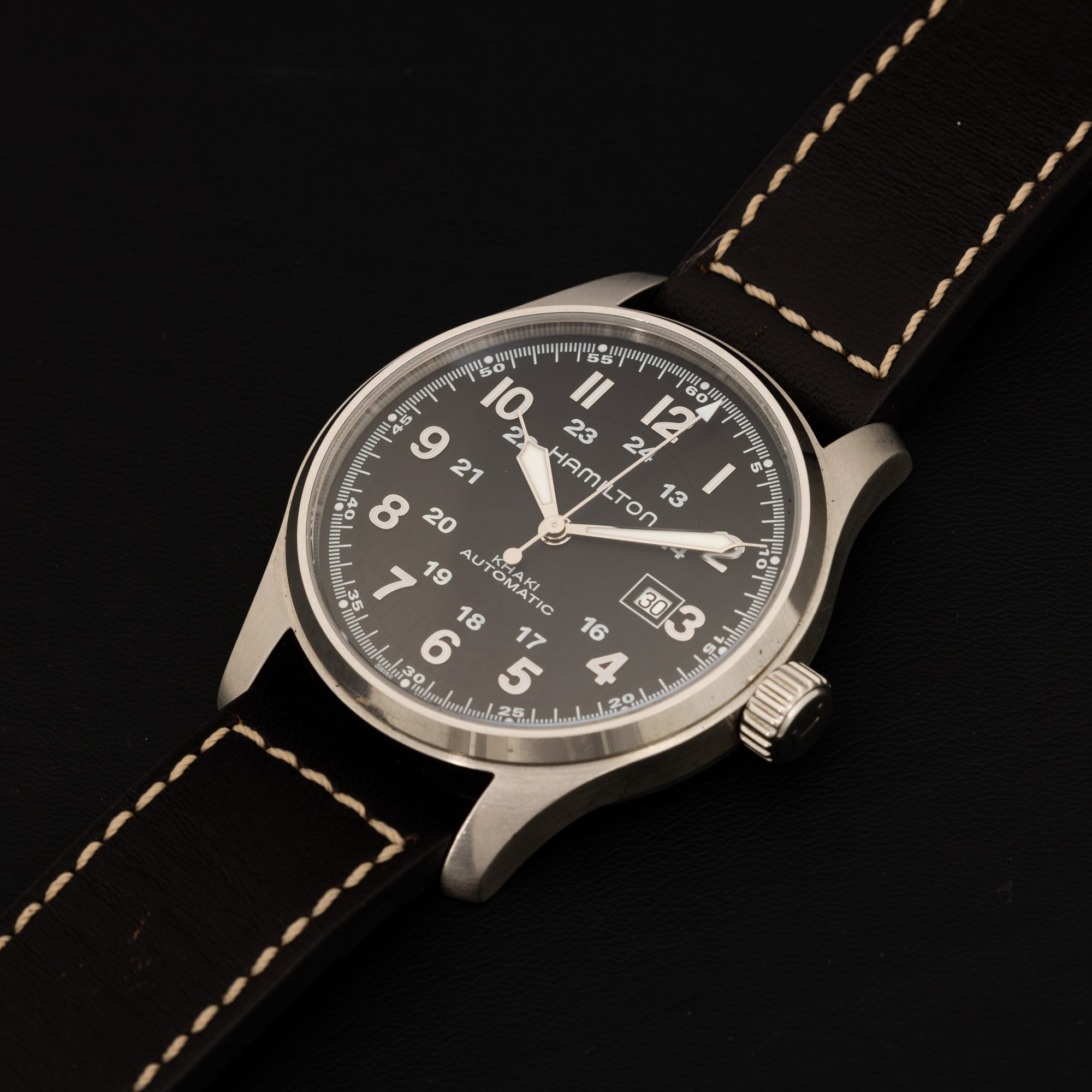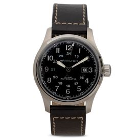 Khaki Automatic in acciaio, quadrante nero opaco con numeri Arabi e indicazione della data, 44 mm
