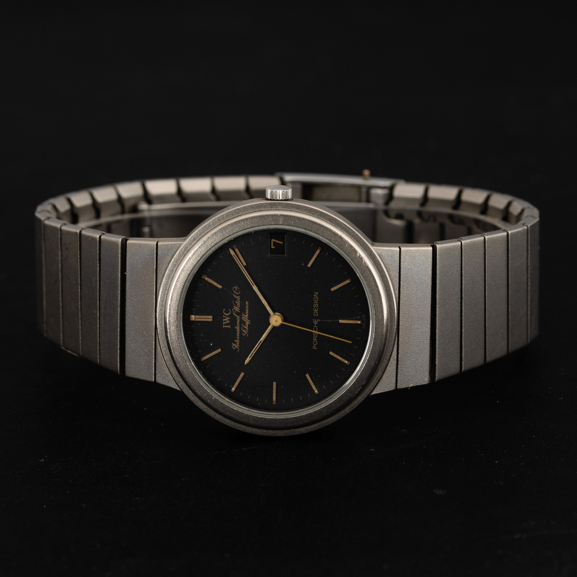 Porsche Design lady in titanio, quadrante nero con indici dorati e datario, 32 mm