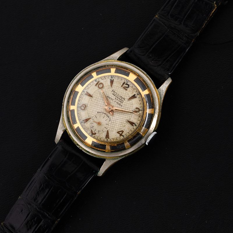Orologio in metallo cromato solo tempo carica manuale, quadrante guillochè indici applicati, 36 mm