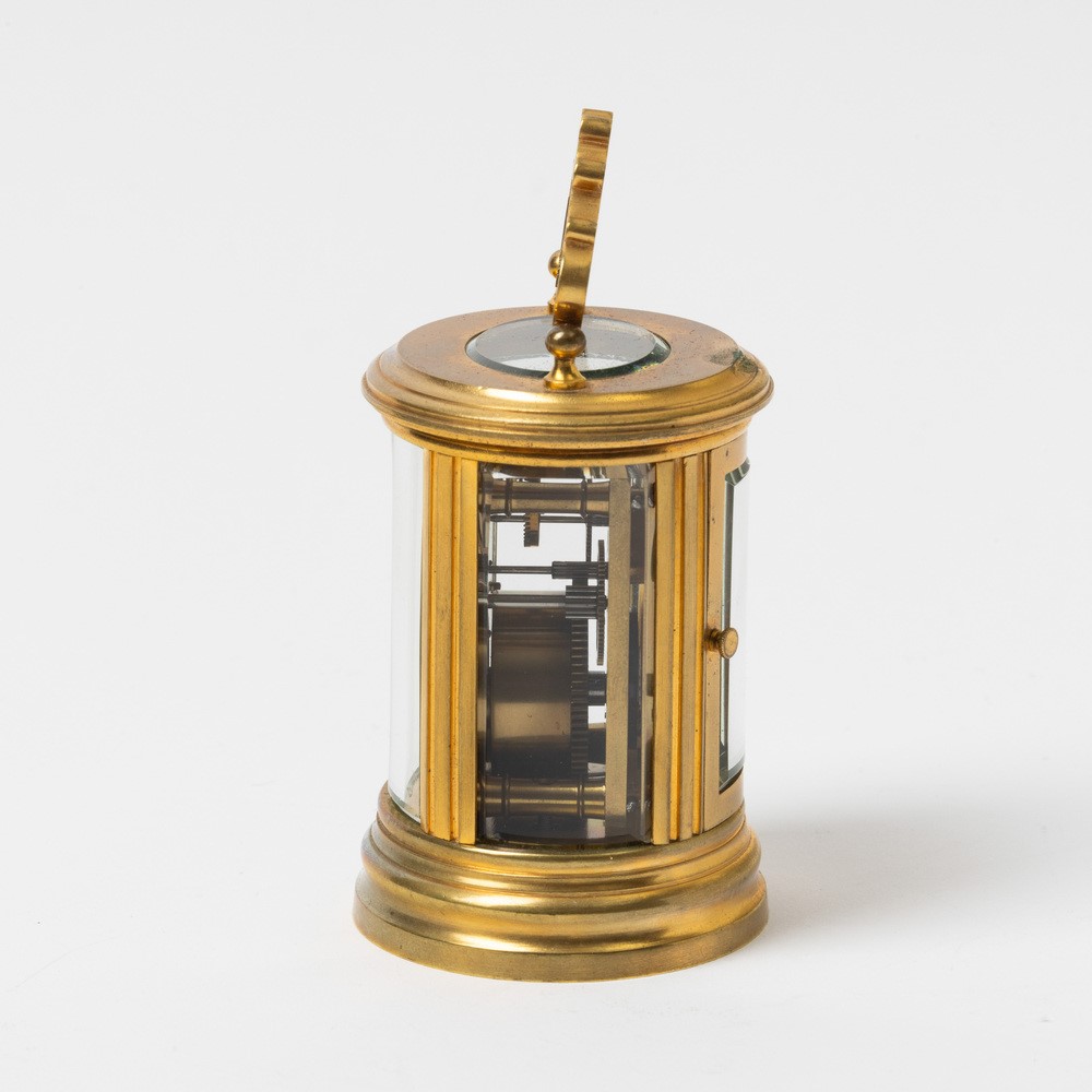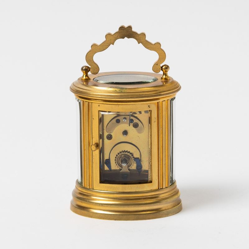 Pendolino da viaggio, anonimo, cassa in metallo e cristallo ,1930/1940, quadrante in smalto bianco, carica a chiavetta, custodia originale in pelle, 74x63 mm