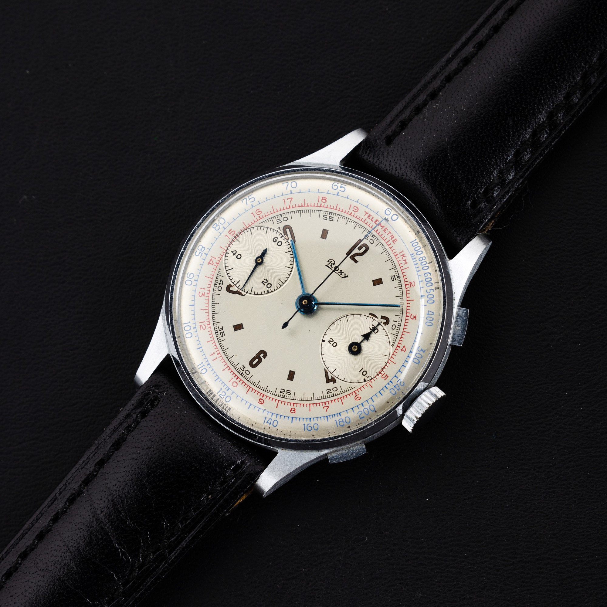 Cronografo due contatori tasti quadri carica manuale, quadrante argentè con scale tachimetrica, 38 mm