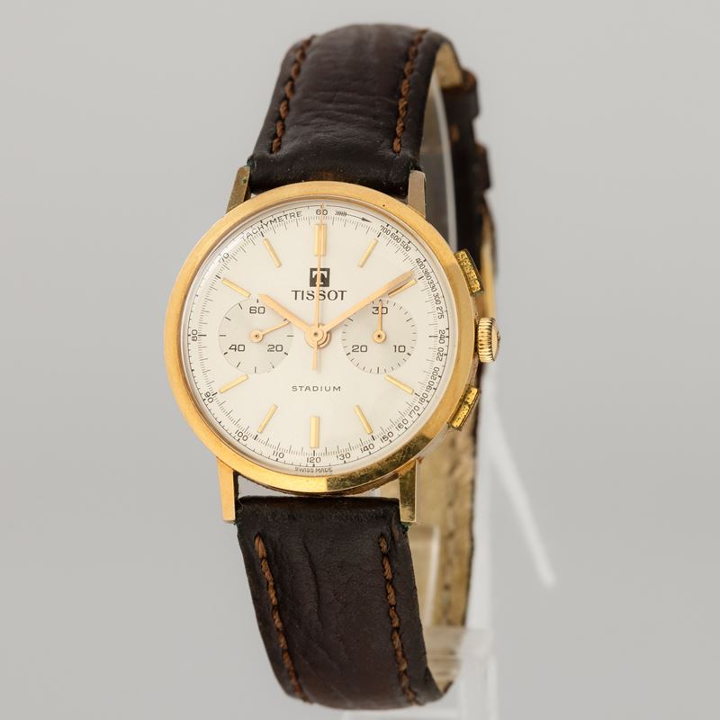 Stadiu, cronografo due contatori in oro giallo 18k, tasti quadri e quadrante Argentè, 34 mm