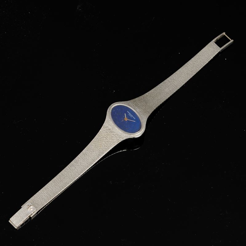Orologio di forma ovale orizzontale in oro bianco 18k con bracciale integrato e quadrante in Lapis, carica manuale, 16x25 mm