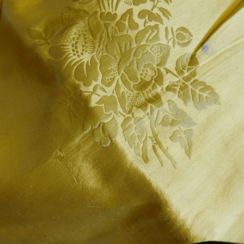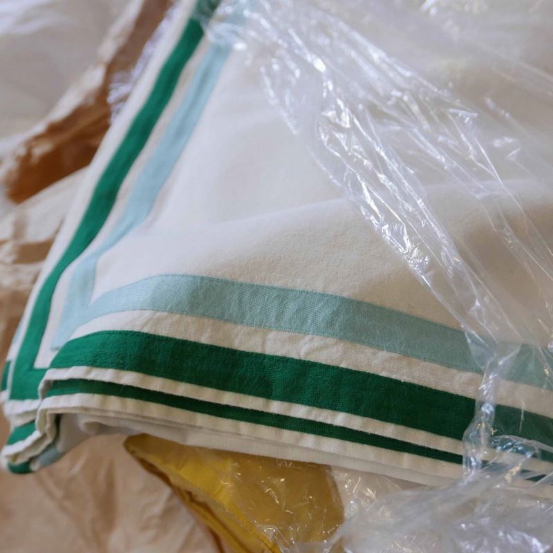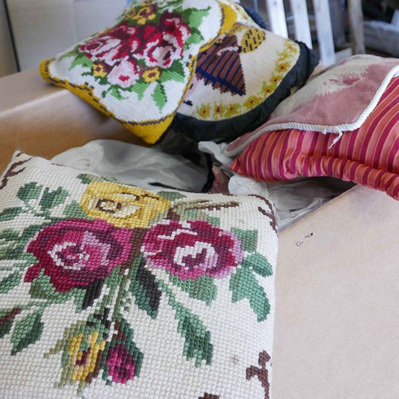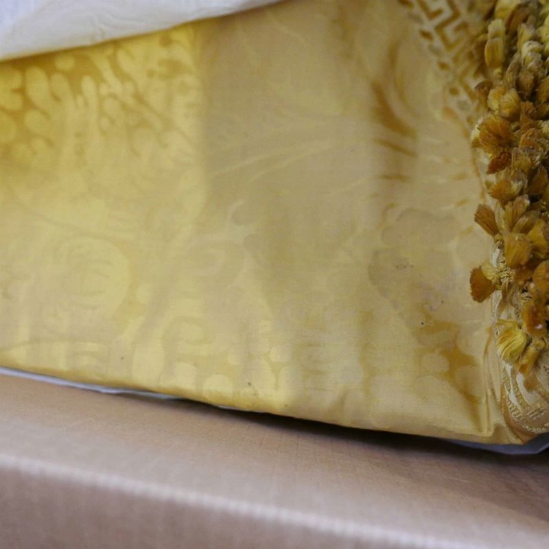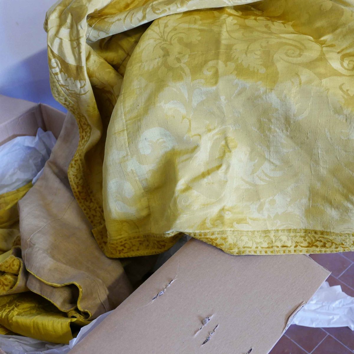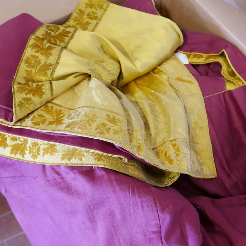 una contenente tre tovaglie rettangolari bianche, due copri tavolo un copriletto in seta gialla due cuscini in velluto bordeaux due tende in pizzo, una tende e copriletto in damasco giallo e una cuscini di varie fogge e materiali.