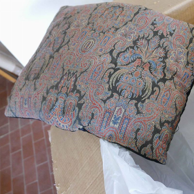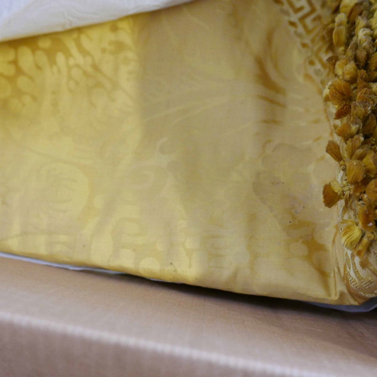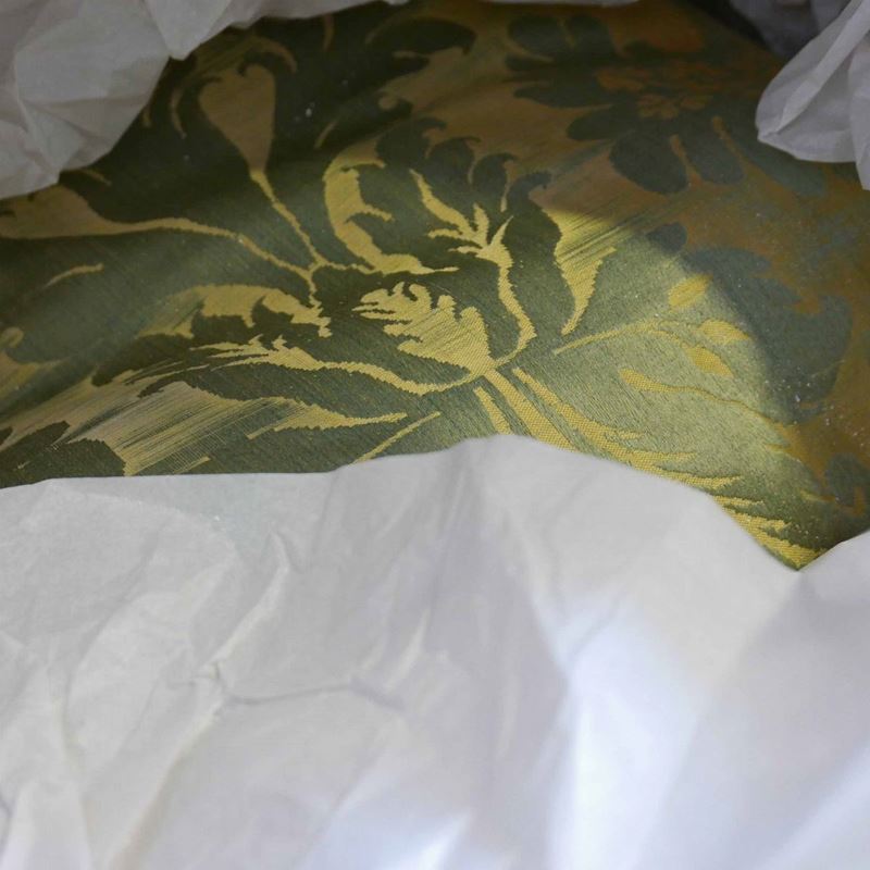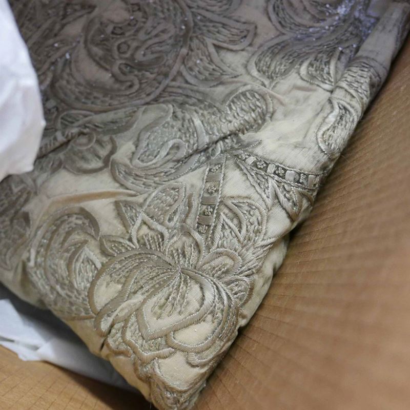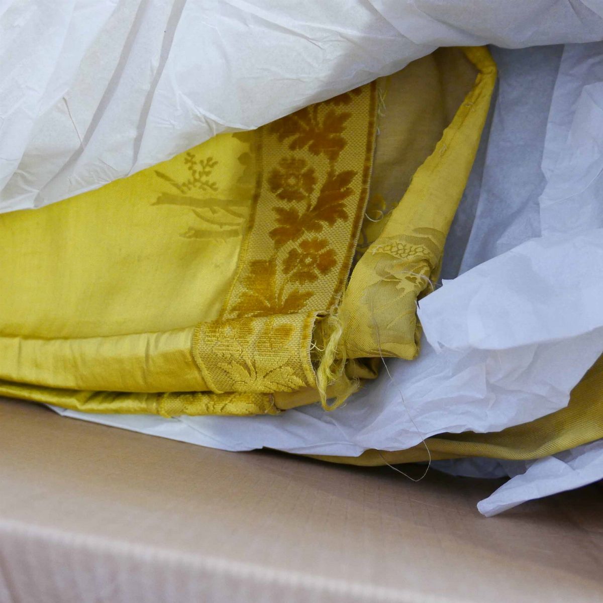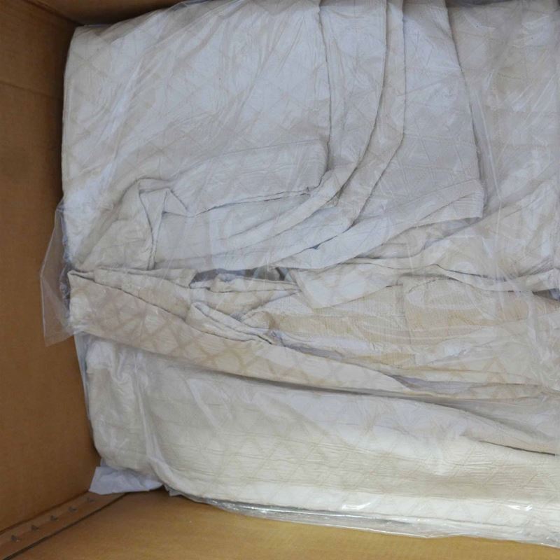 una contenente tre tovaglie rettangolari bianche, due copri tavolo un copriletto in seta gialla due cuscini in velluto bordeaux due tende in pizzo, una tende e copriletto in damasco giallo e una cuscini di varie fogge e materiali.