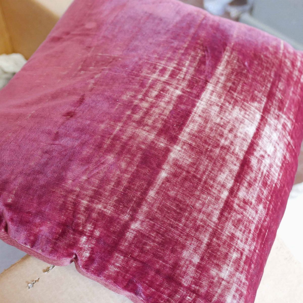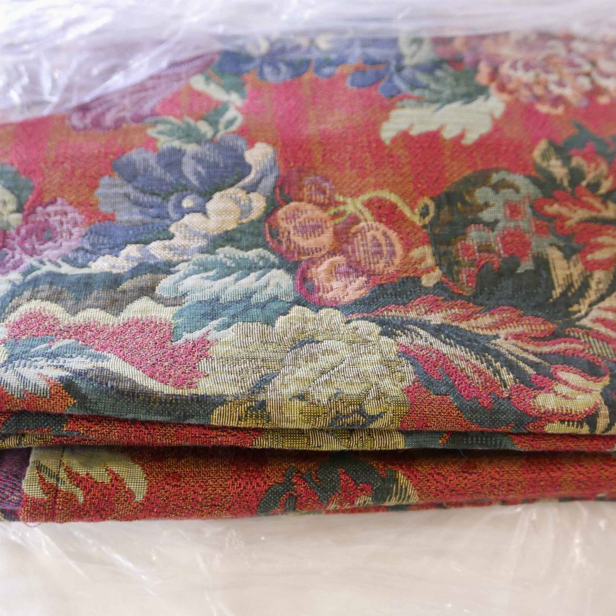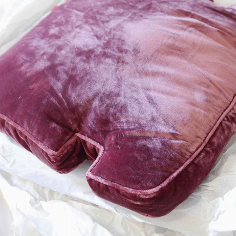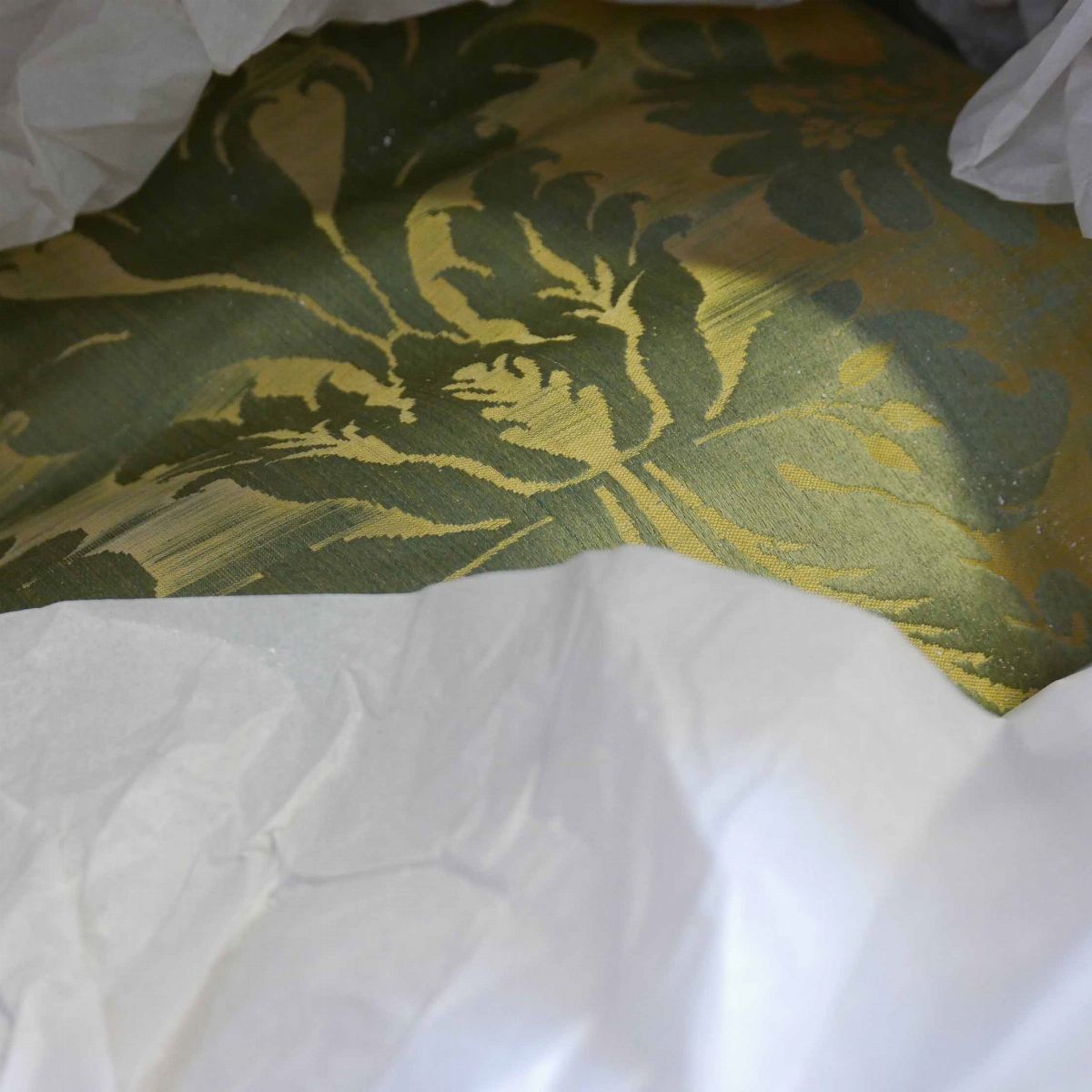 una contenente tre tovaglie rettangolari bianche, due copri tavolo un copriletto in seta gialla due cuscini in velluto bordeaux due tende in pizzo, una tende e copriletto in damasco giallo e una cuscini di varie fogge e materiali.