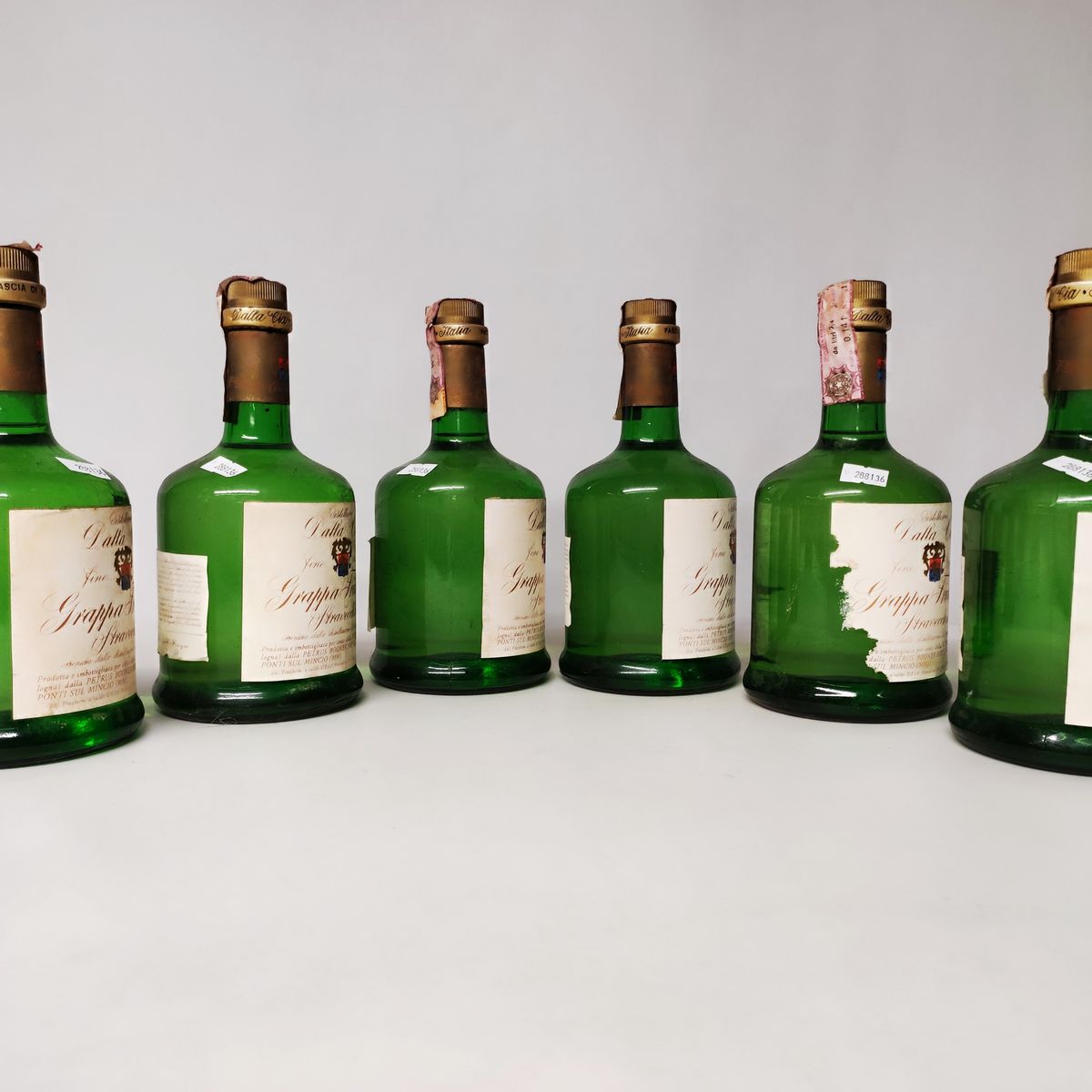 Etichette, capsule e confezioni originali ove presenti con segni d'usura del tempo