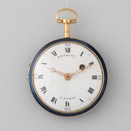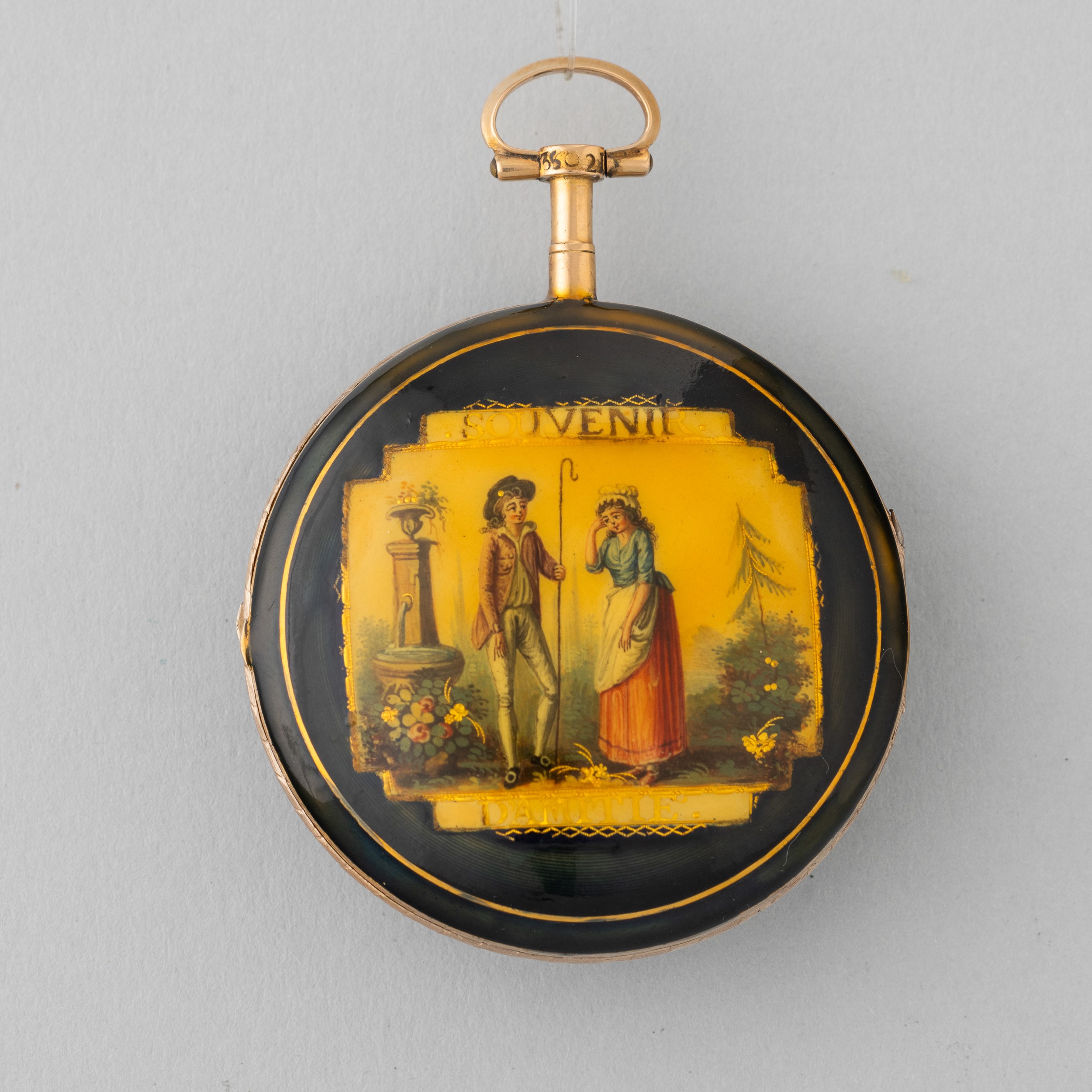 Cassa in oro 18 k (testato), movimento con scappamento a verga, quadrante in smalto bianco con difetti e piccole mancanza, 1800 circa, , con smalto al retro (restaurato), carica a chiavetta