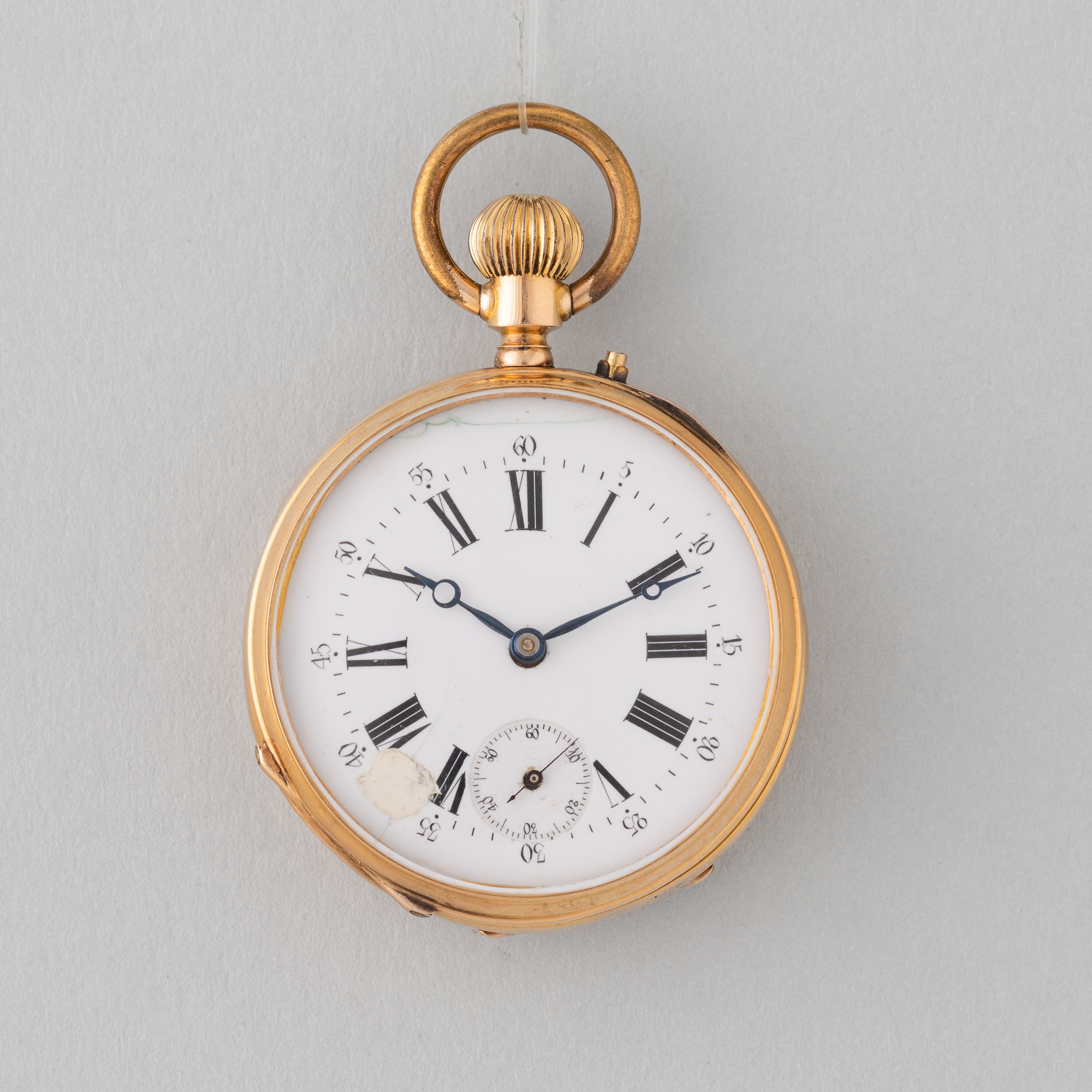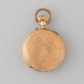 Cassa in oro 18 k cesellata firmata, scappamento con movimento a cilindro, carica a remontoir, quadrante con mancanze