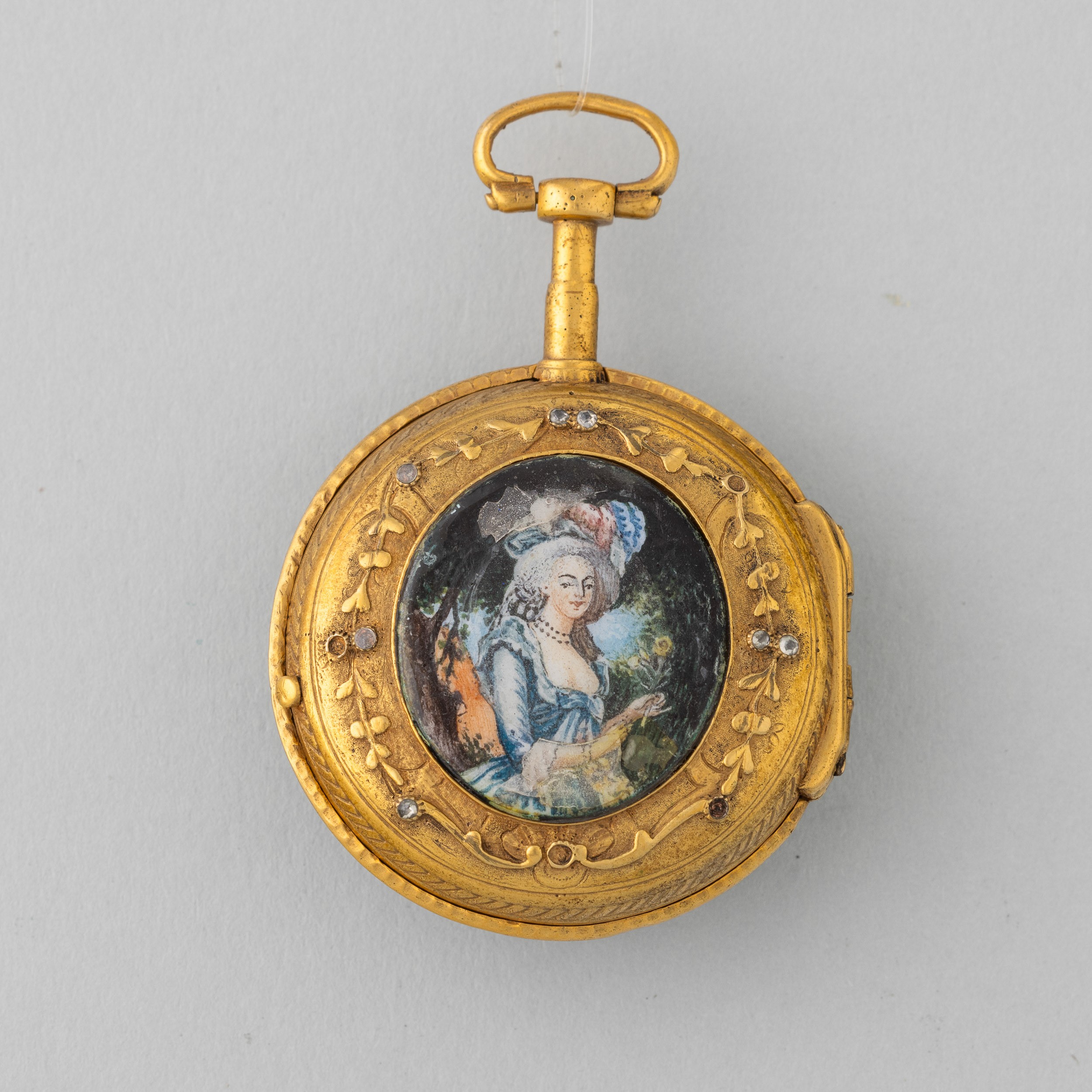Cassa in ottone dorato con pietre dure al fronte, smalto al retro danneggiato, movimento con scappamento a verga, quadrante danneggiato
