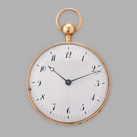 Cassa in oro 18 k (testata), couvette in metallo, carica a chiavetta, suoneria su gong, 1860 circa, quadrante in smalto bianco con mancanze