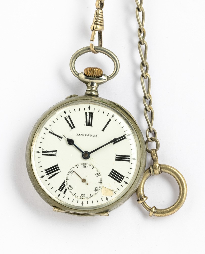 Cassa in metallo, 930-1940 circa per le ferrovie, quadrante danneggiato