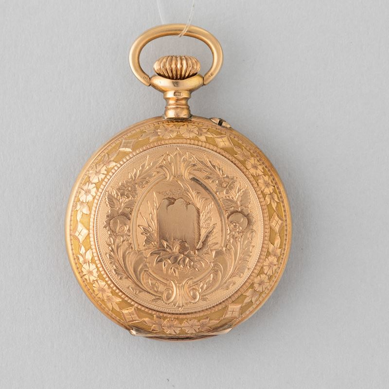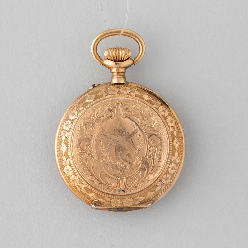 Cassa in oro 14 k, movimento con scappamento a cilindro, 1880, quadrante in smalto bianco, carica remontoir