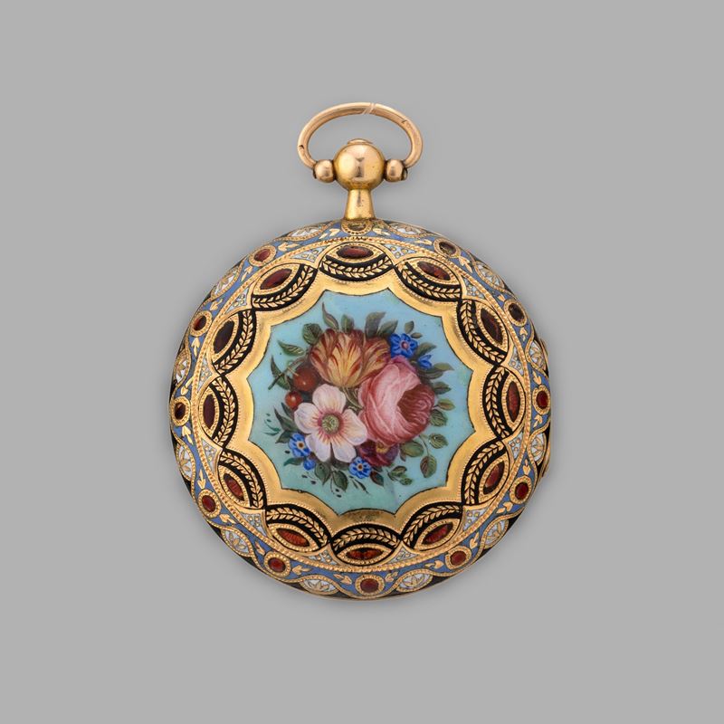 Cassa in oro 18 k (testato) con smalti al retro,piccoli difetti, carica a chiavetta, scappamento con movimento a verga