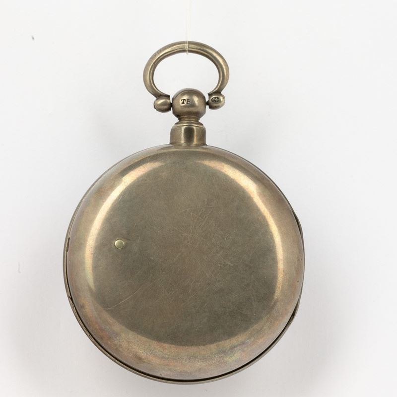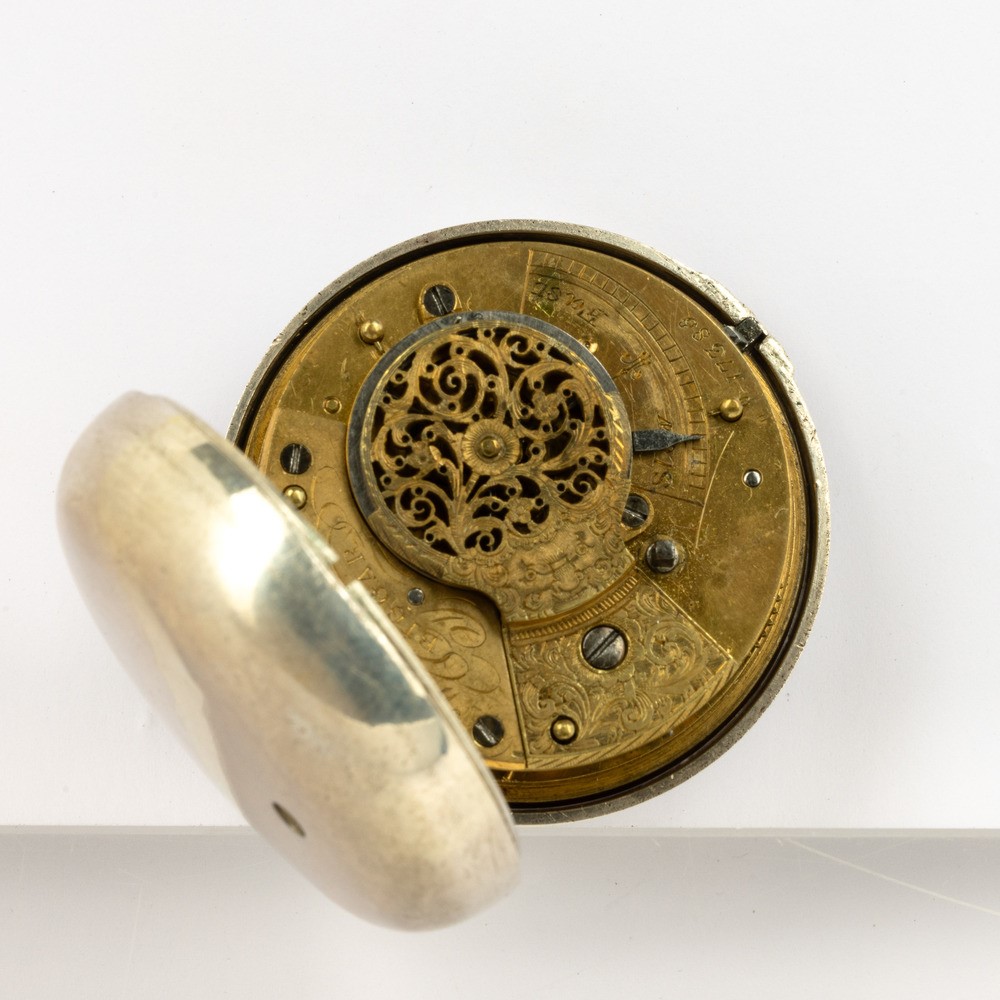Orologio inglese da tasca di metà del XIX secolo con doppia cassa in argento, ribaltina e scappamento a verga. Quadrante in smalto bianco.