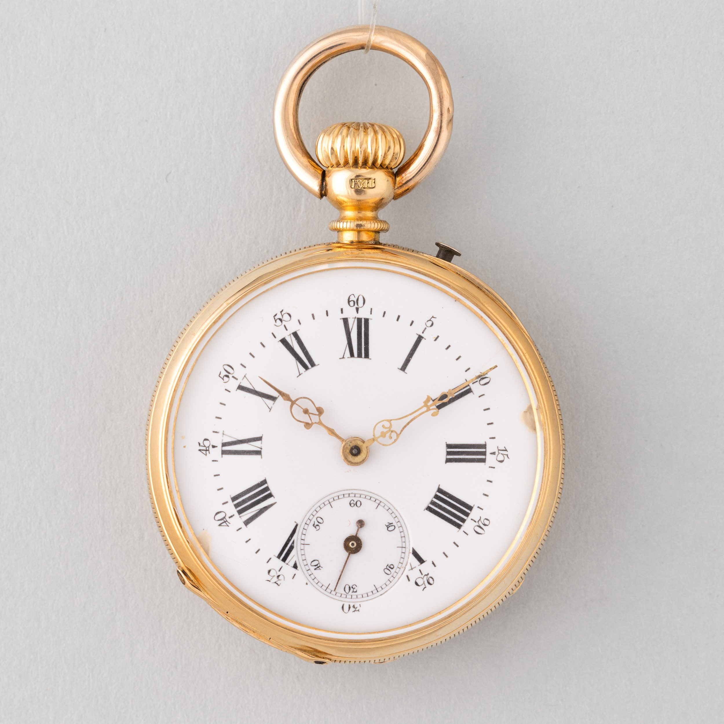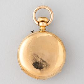 Piccolo orologio da tasca, cassa in oro 18 k, movimento francese anonimo per il mercato inglese, 1880/1890, distributore Samson, quadrante in smalto , lancette sostituite.
