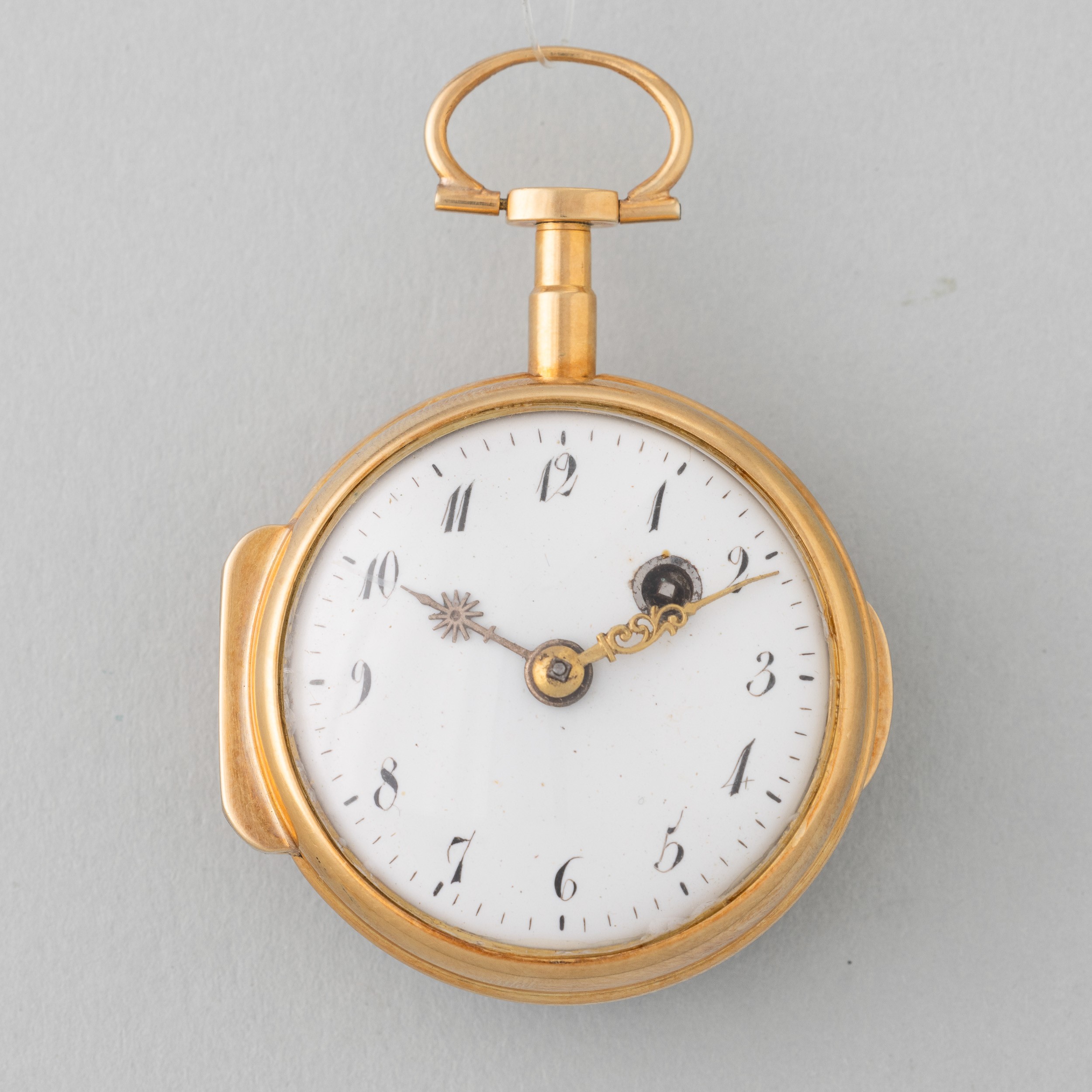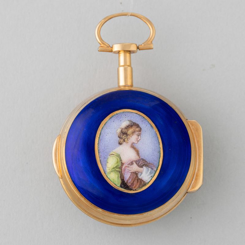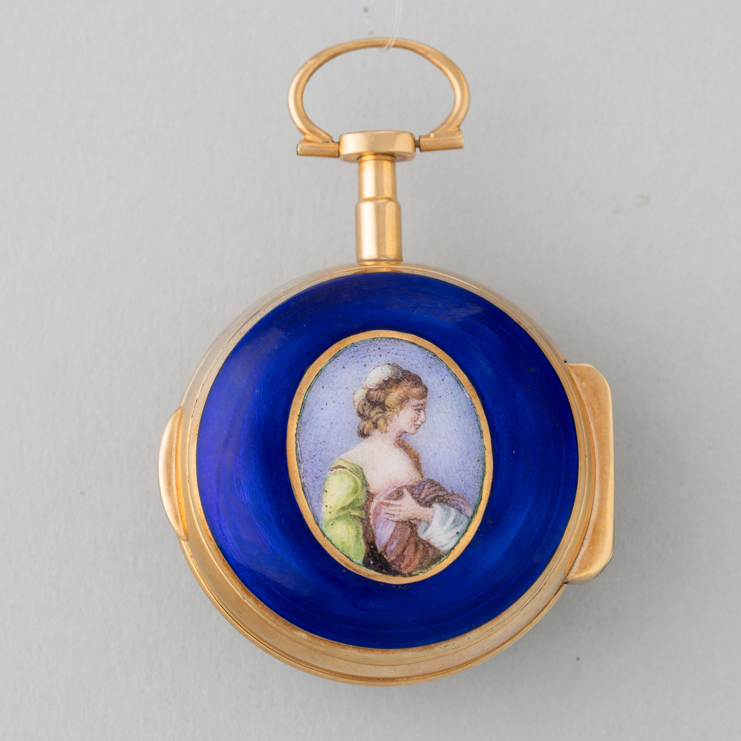 Cassa in oro 18 k (testato), di recente produzione con smalto al retro, movimento a verga anonimo, 1790 circa reincassato