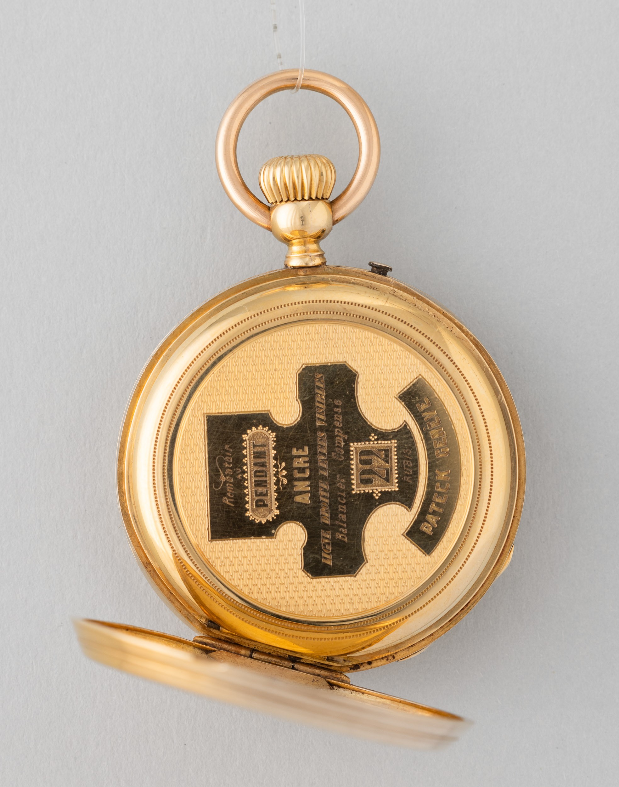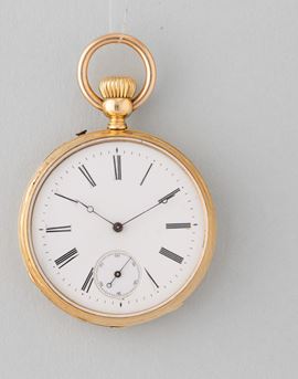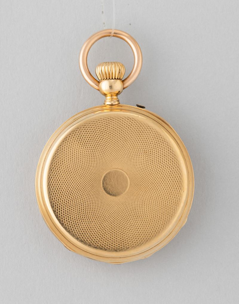 Cassa in oro 18 k, 1880 circa, scappamento con movimento ad ancora firmato Pateck Geneve, carica remontoir, quadrante in smalto bianco con secondi alle 6