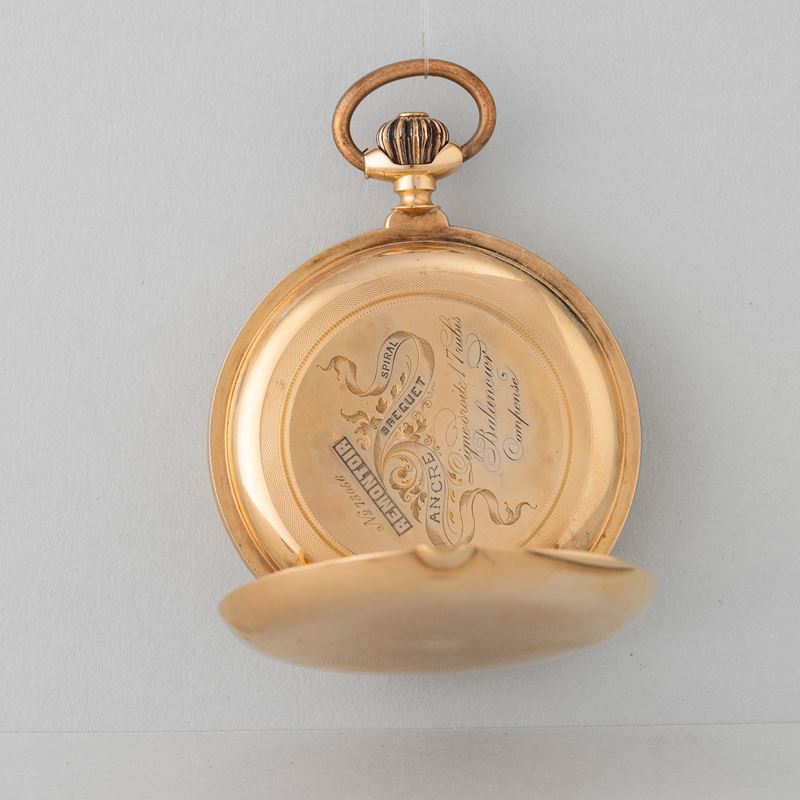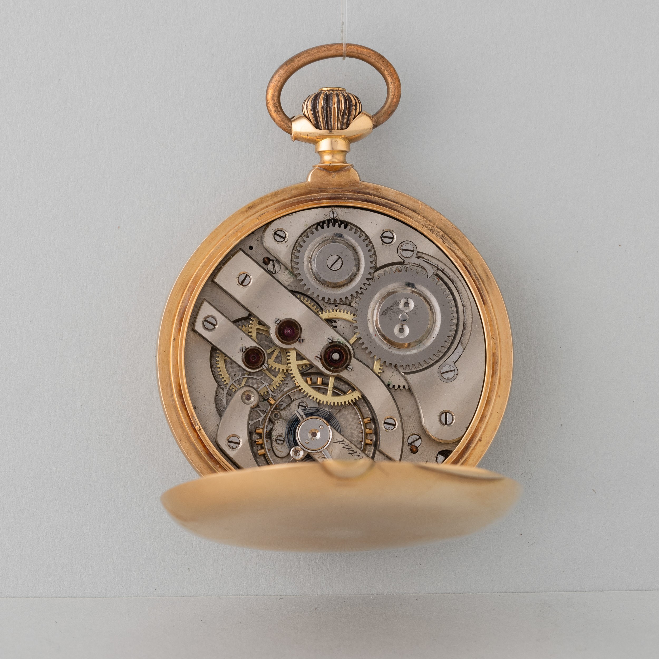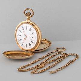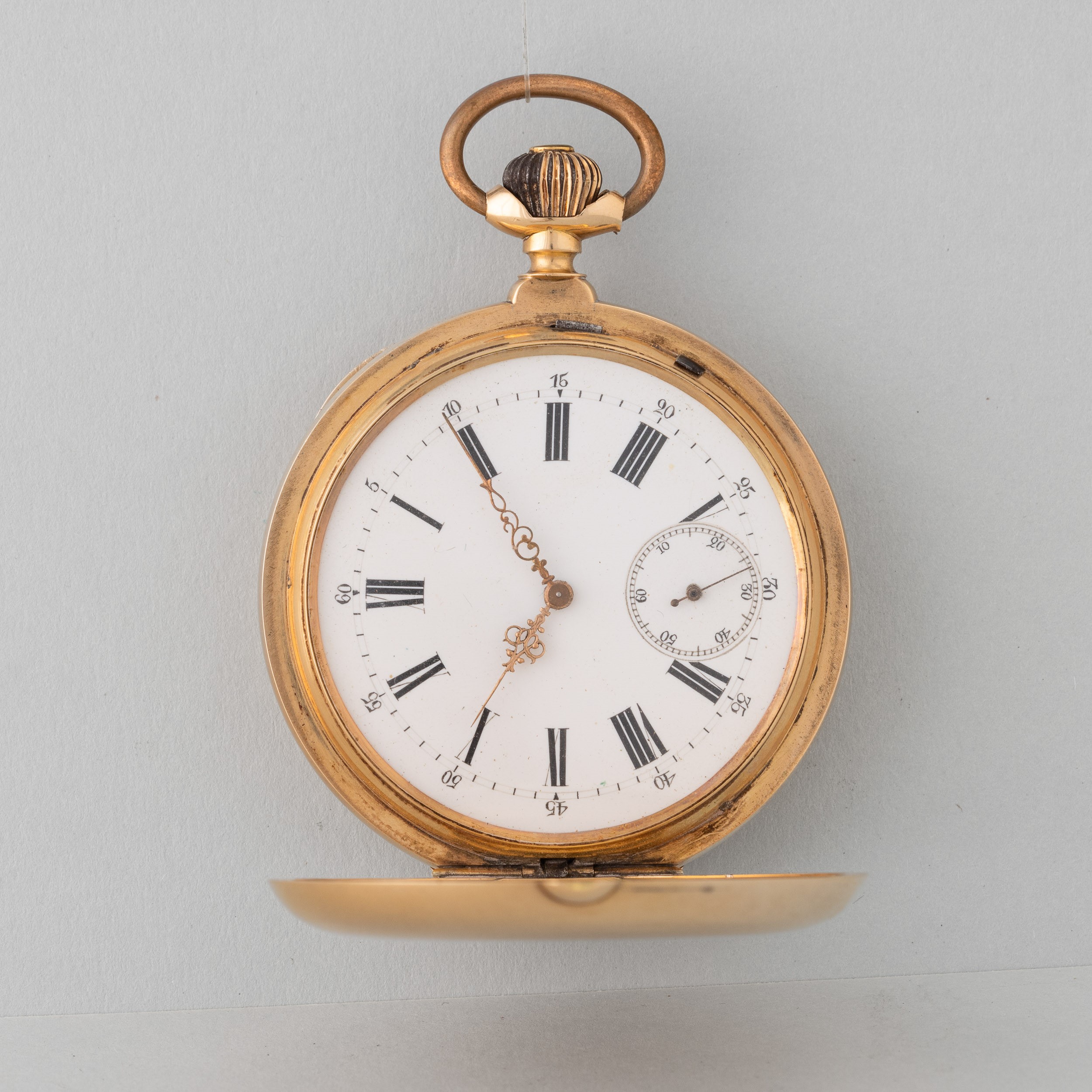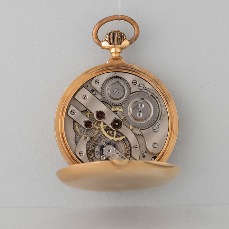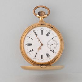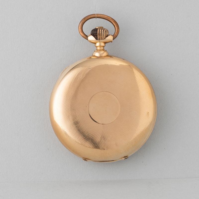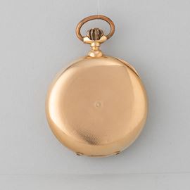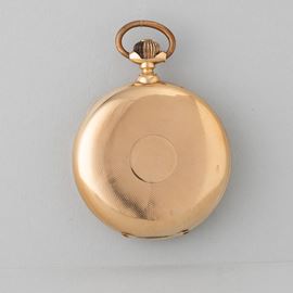 Cassa savonette in oro 14 k, 1880 circa,, movimento con scappamento ad ancora, quadrante in smalto bianco